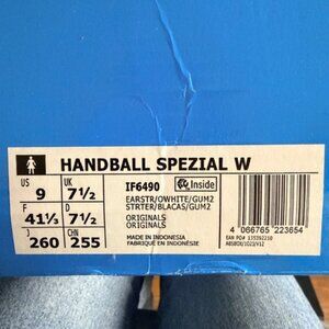 Brown / tan Adidas Handball Spezial sneakers. Women's 9. New in box; come with extra laces. These run about a half size large (IMO), would best fit someone closer to 9.5. So cute and comfy, I love them but am not able to wear them.