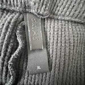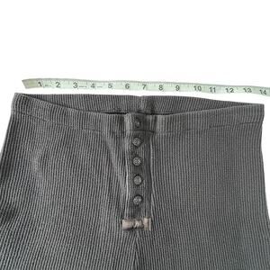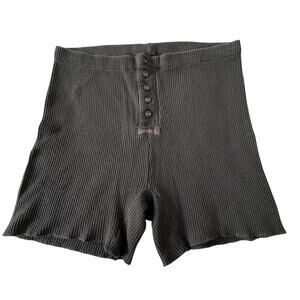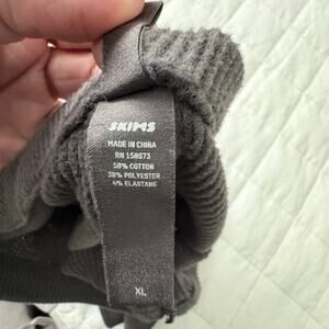 Skims waffle knit thermal lounge shorts in charcoal gray. Soft and stretchy ribbed fabric with button front detail and subtle logo patch. High-waisted fit, great for layering or cozy indoor wear. Tagged size XL. Excellent pre-owned condition with no flaws.