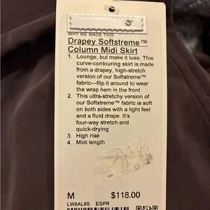 Lululemon Sz. Med. Drapey Softstreme Column MIDI Skirt High Rise $118 MSRP NWT