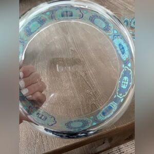 Part of the highly collectible 2015 Centennial Vintage Charm series, the "Mod Kitchen" pattern (often called Blue Medallion or Pinwheel) features a gorgeous teal and navy blue mandala design on clear glass.