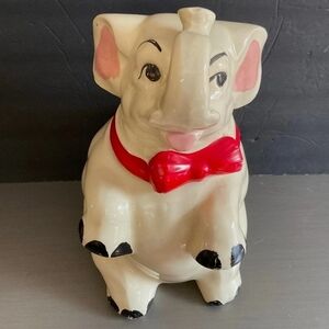 Vintage Shawnee Elephant Cookie Jar is a charming addition to any kitchen or collectibles collection. Made from ceramic and porcelain, this large white jar features a single compartment with a lid, making it perfect for storing and displaying your favorite treats. With its antique vintage appeal and unique design, this Shawnee cookie jar adds a touch of nostalgia to any home decor. Made in the United States, this item is a true testament to quality craftsmanship and timeless style.