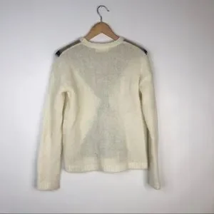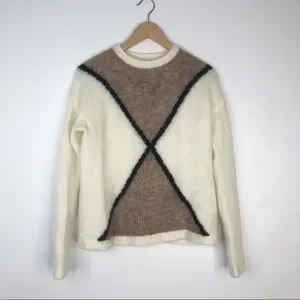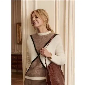 Elegant crew neck sweater. Features white and brown color blocks. Soft and stylish design.