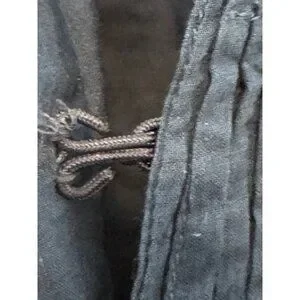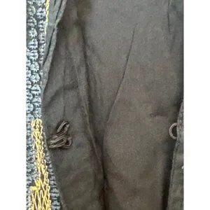 This open-front jacket features a unique textured pattern in navy and beige tones. Made of a breathable cotton blend, it also includes a secure loop closure for subtle detailing.