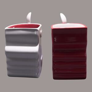 Design: Two square-shaped mugs that interlock with a kissing face profile; each mug includes a matching ceramic teaspoon that fits into the handle.