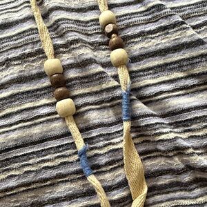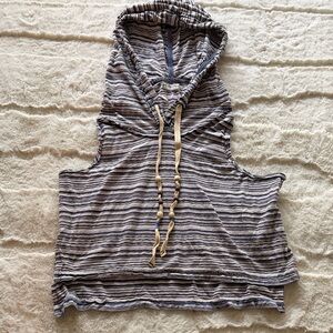 Wooden bead detail. Sleeveless. Casual sleeveless hoodie with a striped pattern. Features a comfortable hood and drawstring. Perfect for layering or standalone wear.