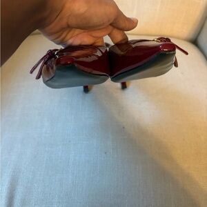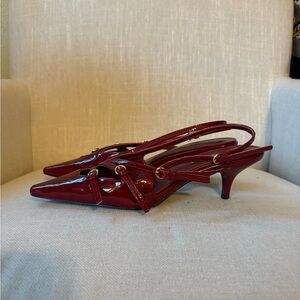 Elegant Miu Miu heels in glossy burgundy patent leather. Features stylish strappy design and kitten heel. Perfect for elevating any outfit. See pictures for wear on bottom. Size 39 but with pointy toe I think fits an 8/8.5 best.