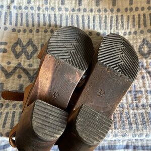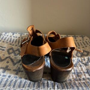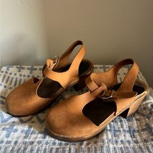 Adorable and versatile camel-color leather clogs, dark brown stain on the wood sole, tstrap/maryjane style, adjustable buckle. Easy to maintain and they clean up easily with a light sanding & restaining of the wood and buffing the leather. Fantastic quality.
