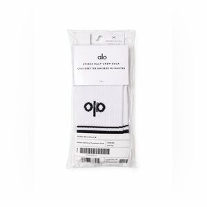 Brand new ALO Yoga Half-Crew Throwback Socks in white with black logo detailing. These unisex socks feature a classic athletic ribbed knit with a clean, minimalist throwback design. Ideal for everyday wear, workouts, yoga, pilates, or casual athleisure styling.