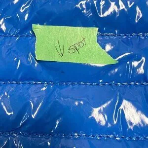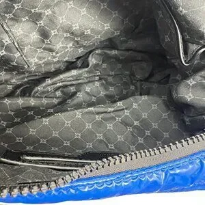 Blue puffy stitched 100% nylon.