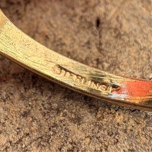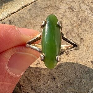 Jade jadeite Marquise Cut Gold Tone Sterling Silver that's approximately a size 7. It's absolutely stunning and so unique. The inside is marked Sterling. It is a vintage ring that is so lovely and is in good preowned condition. It has a gold tone to it. The Gold has faded slightly, but still looks pretty. Inventory six.