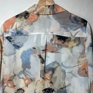 Color: Blue, peach, tan in a floral/watercolor pattern