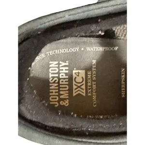 These are pre-owned Johnston & Murphy XC4 Extreme Comfort System men's shoes, size 11M. The exterior is constructed from a dark blue suede and leather upper. They feature lace-up closures and a light gray midsole with a dark gray outsole. The shoes show minimum signs of wear, including some scuffing and discoloration on the suede. The interior lining is intact, and the soles exhibit moderate wear. Overall good condition