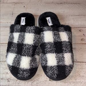 Old Navy, black and white fuzzy slippers. New without tags, Old Navy has been marked through with a permanent marker. Nothing wrong with them. They are fuzzy and look warm inside. size 8 has a checkered print on the shoes
