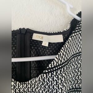 This Maje dress showcases a chic black and white geometric pattern, perfect for casual or work settings.