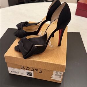Chic black peep-toe heels with elegant bow detail. Signature red sole for a touch of luxury.worn once!