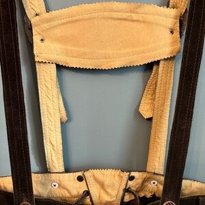 Experience traditional style with these brown lederhosen that has intricate embroidery and adjustable suspenders. Perfect for cultural events or a unique fashion statement. Real leather.
