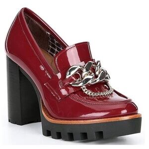 Elegant burgundy patent leather heels with bold chain detail. Perfect for elevating any outfit.
