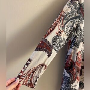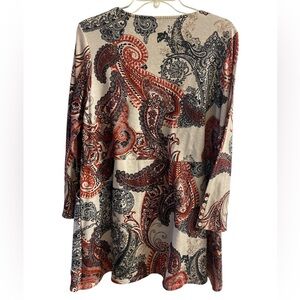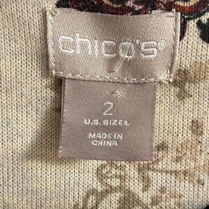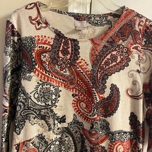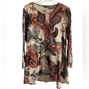 Chico's tunic with a beige base and brown pattern. Soft texture.