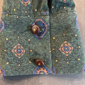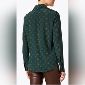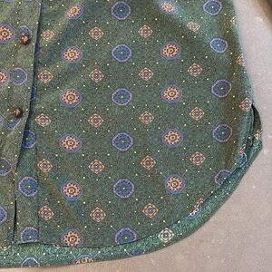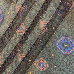 Beautiful silk blouse with lace detail. Deep forest green with caramel, black and indigo paisley-like pattern.