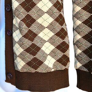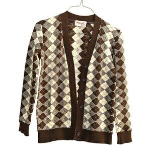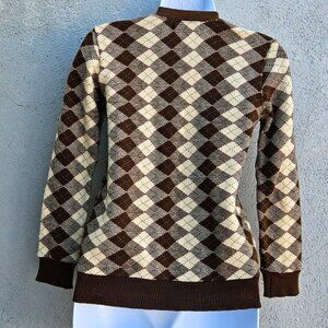 1970s Japan Knit Cardigan XS Argyle Brown Cream V-Neck Button Front