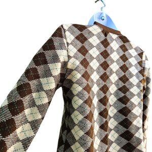 Vintage 1970s Japanese argyle knit cardigan by MoUvais Goût Tokyo in a fitted XS silhouette with classic brown-and-cream pattern. Best fits Women’s XS; may also suit XXS or Petite frames. Please compare measurements!