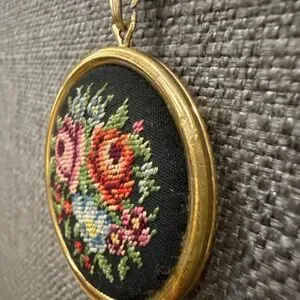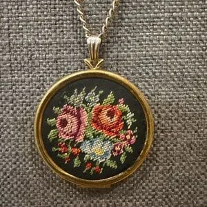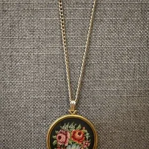 The necklace features a round, gold-toned locket with a colorful, hand-stitched needlepoint (often described as petit point or cross-stitch) floral bouquet on a black background.