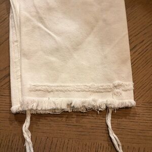 They are characterized by a straight-leg crop fit, mid-to-high rise waist, and heavy distressing at the knees and raw hems.