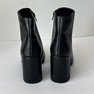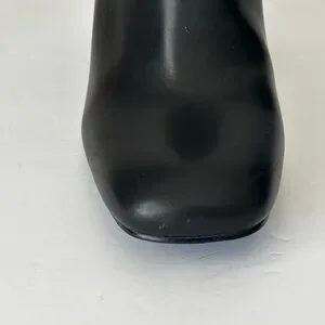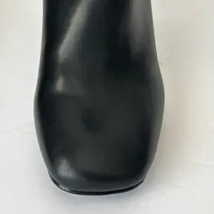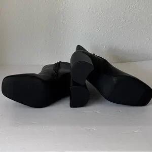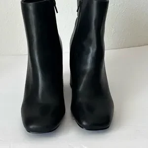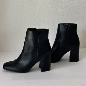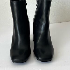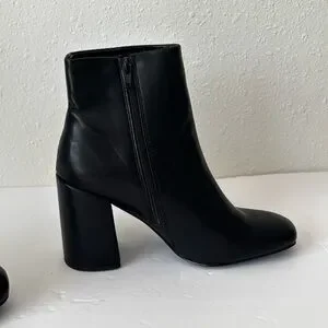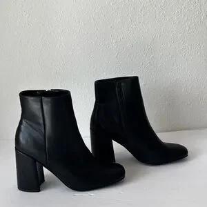 Sleek black ankle boots with a square toe and sturdy block heel—easy to dress up or down.