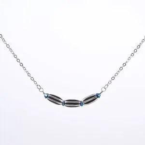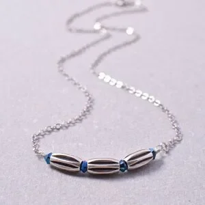 A perfectly dainty silver necklace. Three silver tubular beads with oxidized grooves are accented with bi-cone blue Swarovski Crystal beads. Hung on a delicate silver chain. Perfect for every day!