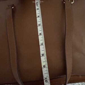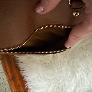Stylish Coach tote in rich tan leather. Features dual handles and signature tag. Ideal for daily use.