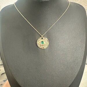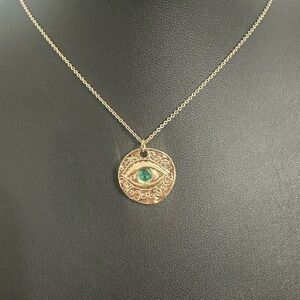 Stunning EXPRESS Evil Eye pendant necklace featuring a round gold-tone medallion with ornate scroll detailing and a beautiful teal glass stone at the center. Trendy, symbolic, and perfect for layering or everyday wear!