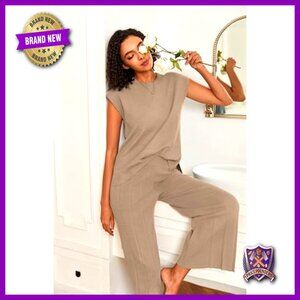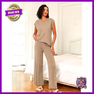 Knit Two Piece Set Cap Sleeve Top Wide Leg Pants Lounge Outfit
