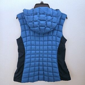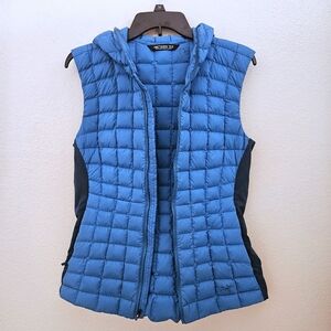 In beautiful condition, this is the women's Arc'teryx "Narin" Vest. Filled with down, this is a quilted puffer with a hood and side pockets. The shell is made of 100% Nylon and the Contrast is 100% polyester. The insulation is made of grey goose down. This comes in a beautiful blue and is a women's size Medium. I've included the manufacturer's description down below as well: