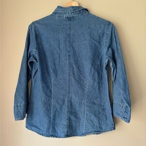 Vintage denim button up jacket with brown lace floral details and 3/4 sleeves. Super cute and unique jacket that looks good with any outfit! Size S
