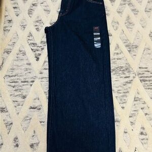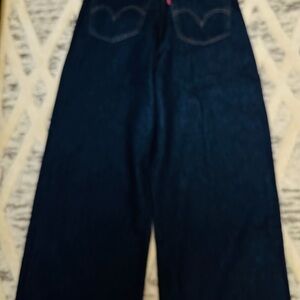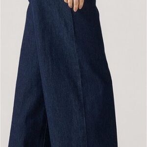 Elevate your style with these chic dark blue wide-leg jeans. Perfect for any occasion, these jeans offer both comfort and fashion. 31” high rise