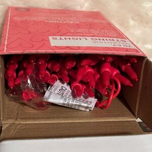 NWOT 70 count Valentine string lights. Perfect for indoor and outdoor use. Features steady burning or flashing options. Plug in with connector plug on end. 14’ total length.