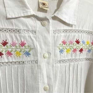 White cotton blouse featuring colorful hand embroidery, lace trim, pintuck pleats, and a button-front closure in a relaxed fit. Made from manta, a soft cotton fabric often used in traditional Mexican clothing. It feels light, a little textured, and lets your skin breathe — comfy, cool, and easy to wear all day. Excellent pre-owned condition 100% cotton No size tags, measures like a Medium/Large Chest (pit to pit) 22” Length 23.5” Shoulder to shoulder 18.5” Sleeve length 16.5” *modelled photo has been created for style inspiration only, not the actual item for sale