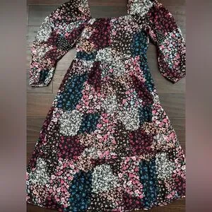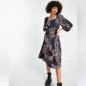 Patchwork square neck midi boho peasant milkmaid cottagecore dress puff sleeve