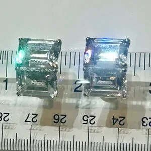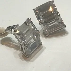 Super bling in a double baguette rhodium setting. Clip on earrings with rubber backing for comfort. Part of the haute couture Carlisle jewelry line.