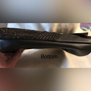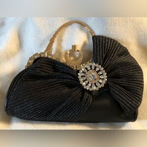 Add a touch of glamour to your outfit with this black clutch, tote or used as crossbody bag. Featuring oversized dazzling bows which th gorgeous crystal accents, it's perfect for any occasion, Especially for those formal or dress up events. Bag is NWTs and comes with 52” gold tone delicate chain to use bag as crossbody.