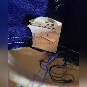 This elegant cream and blue dress features a stylish design perfect for any occasion. The dress combines a soft cream body with striking blue accents, offering a chic and sophisticated look. has one spot of discoloration in cream fabric near bottom back but hard to notice.