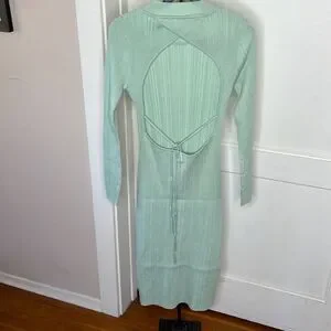 Look no further than this bodycon style dress! The flattering high neckline and long sleeves give it just enough coverage, while the open back with tie feature adds a bit of sass. With such a timeless design, you can never go wrong!