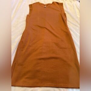 This tan sleeveless dress is perfect for any occasion. Its simple yet sophisticated design offers a timeless look. Ideal for both casual and formal settings.