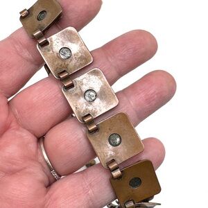 This is a great Midcentury piece from Renoir’s Matisse copper and enamel line of jewelry. Each flat copper square link also has a smaller, cupped square of decorative enamel centered atop. These feature a splatter design of yellows and reds against a green background.