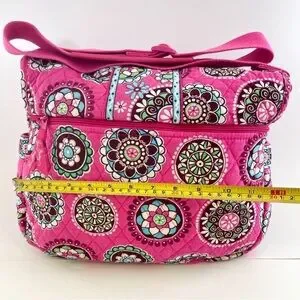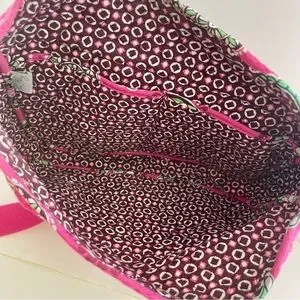This Vera Bradley shoulder bag, Cupcake pattern, showcases a delightful blend of pink and blue hues, crafted in a quilted fabric for a chic look. The intricate medallion pattern adds a touch of elegance, making it a standout accessory. Its comfortable shoulder strap ensures easy carrying for everyday use.