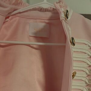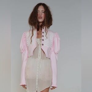 Chic pink blazer with puff sleeves. Features unique button accents. Stylish and bold design.