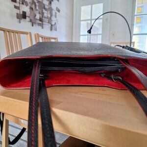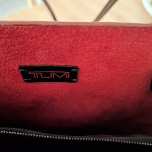 For sale is a beautiful, authentic Tumi black leather tote purse, brand new and never used. This elegant tote features a rich black pebbled leather exterior with a bold red interior lining for a stylish, high-end look. Perfect for work, travel, or everyday use.