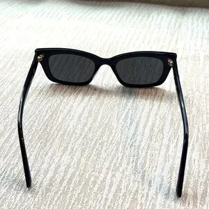Sleek black sunglasses. Rectangular frame. Subtle branding on the arms.