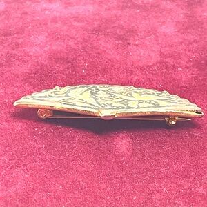 This vintage Spanish Damascene brooch features a unique fan shape adorned with beautiful birds and flowers. The intricate design is highlighted by black and gold accents, adding a touch of beauty and artistry to any outfit. Made of metal, this original piece is a perfect addition to a collection of vintage jewelry, particularly for women who appreciate unique and elegant accessories. Made in Spain, this brooch embodies a blend of Spanish culture and craftsmanship.