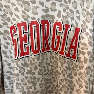 Stay cozy and stylish with this Georgia leopard print hoodie thats perfect with leggings or jeans. Has large pocket in the front and flattering side slits, with hood. Featuring bold red lettering, this sweatshirt is perfect for casual outings. Embrace comfort and fashion effortlessly. Go Dawgs! 🐾